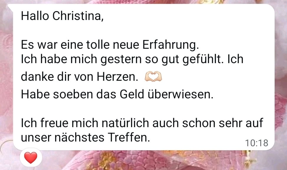 Während einer Cranio Sacral Energetic Balance-Sitzung liegst du bequem auf einer Liege. Ich arbeite mit leichten, achtsamen Berührungen an deinem Schädel, deinem Nacken, deiner Wirbelsäule und deinem Kreuzbein. Zeitgleich nutze ich meine natürlichen Gaben & Fähigkeiten als Heilerin & Medium. Ich arbeite multidimensional, indem ich mich bei Bedarf auch mit deiner Seele verbinde. Wenn es wichtig für dich ist, erhältst du auch Botschaften der Geistigen Welt.